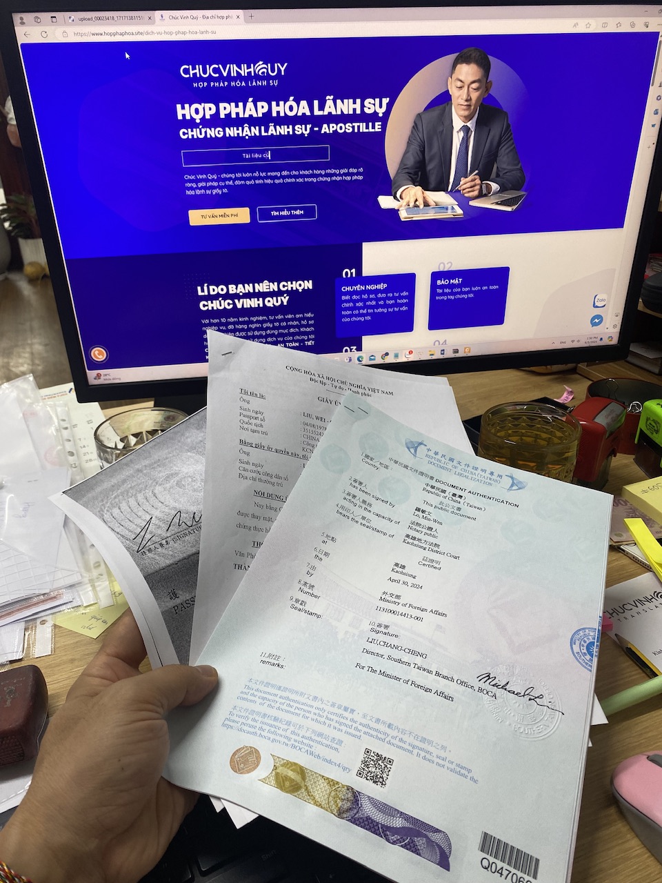 Chứng nhận hợp pháp hoá lãnh sự giấy tờ cá nhân do cơ quan có thẩm quyền Đài Loan cấp đã được Bộ ngoại giao xác nhận cho công dân đang sống và làm việc tại Việt Nam, nay chứng nhận tại Văn phòng kinh tế văn hoá Đài Bắc Hà Nội với nhu cầu mong muốn dùng làm thị thực sang Việt Nam thăm thân cho vợ con theo yêu cầu của Phòng QL xuất nhập cảnh - CA tỉnh Quảng Nam.